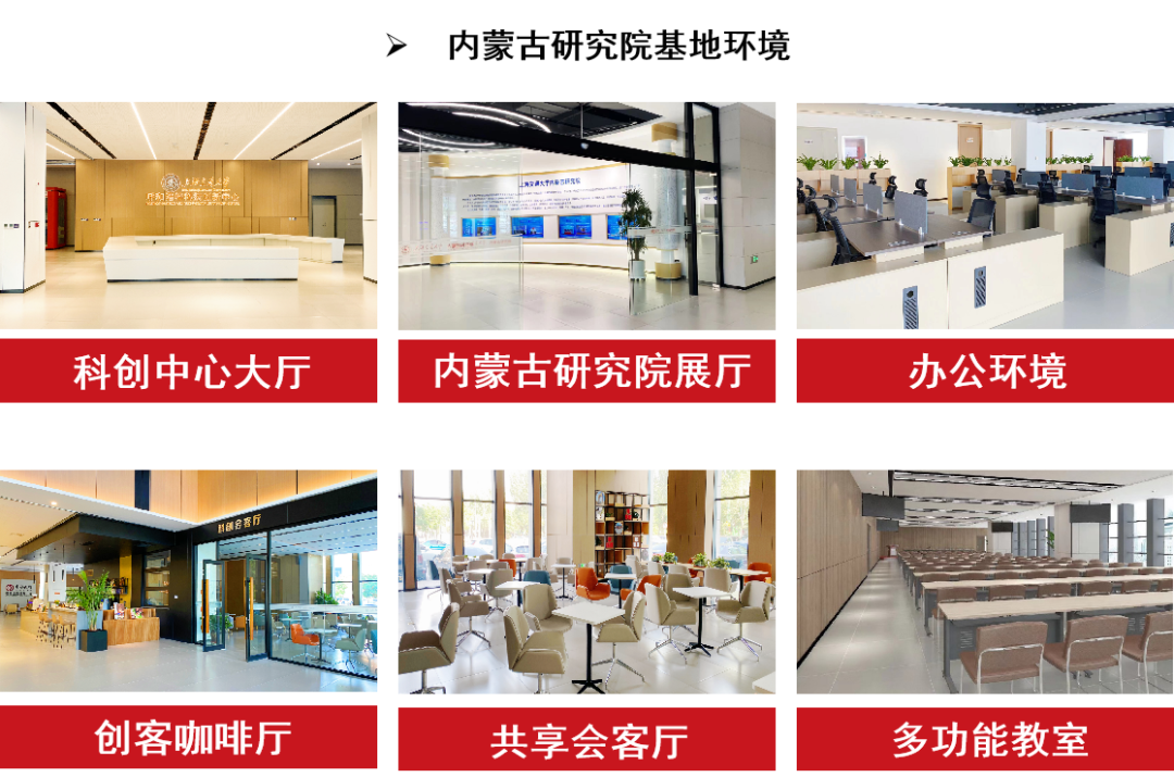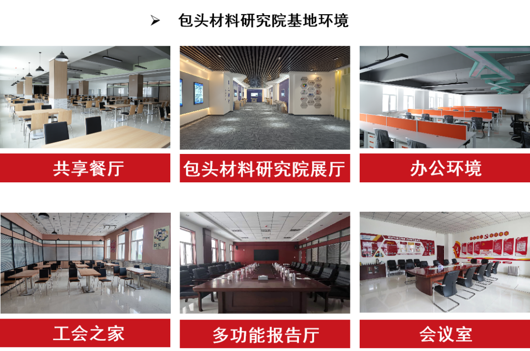 内蒙古研究院联培基地和包头材料研究院联培基地设有展厅、会客厅、创客咖啡厅、多功能会议厅、工会之家、共享餐厅等,办公区设有茶水间、茶歇区,办公区环境优美,宽敞明亮。