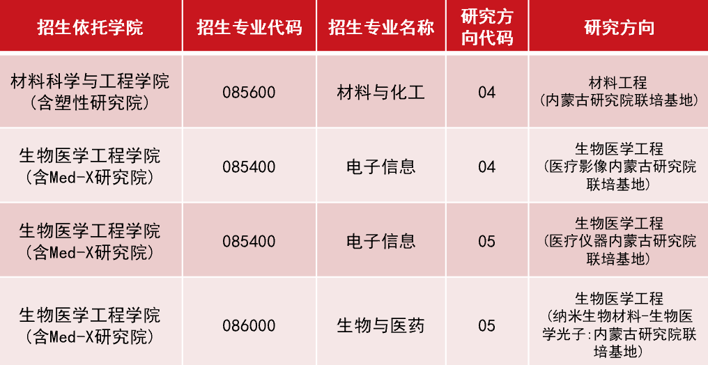 学生须符合上海交通大学相关招生要求(具体见上海交通大学研究生招生网)。2026年计划招收全日制专业学位硕士研究生共计 13 名,其中材料与化工专业共10名,电子信息、生物与医药专业共3名。