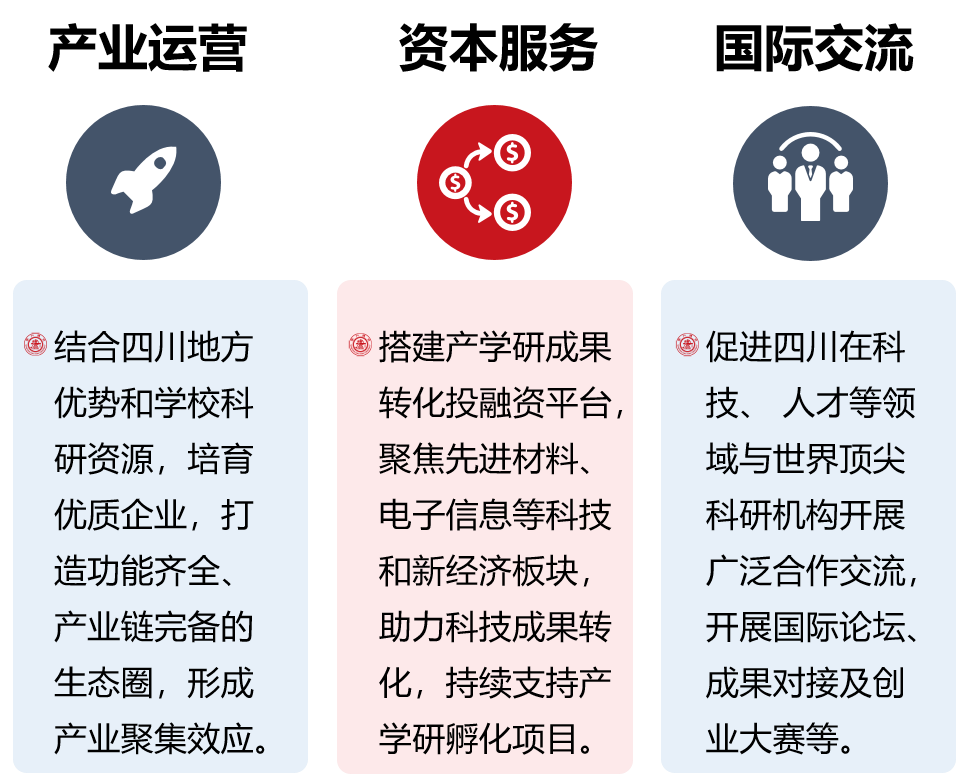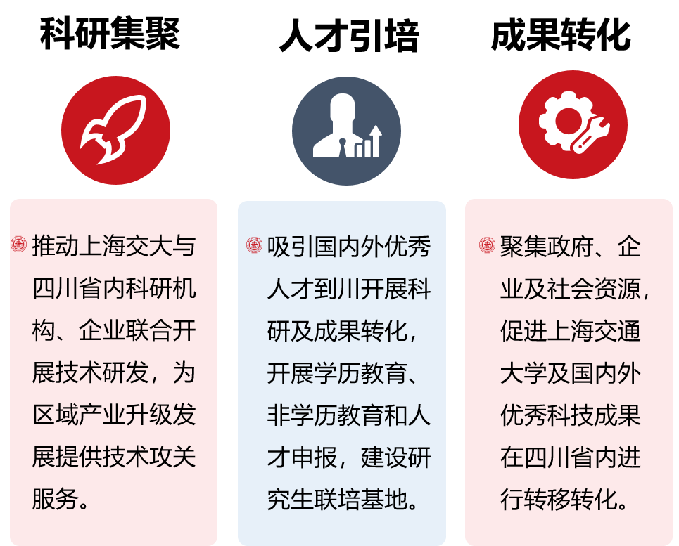 上海交通大学四川研究院于2017年7月揭牌成立,于2018年底启动全面建设,是上海交通大学在川全部科研教育资源的唯一总体管理单位,目标建设国内一流、国际先进的科技成果转移转化平台。