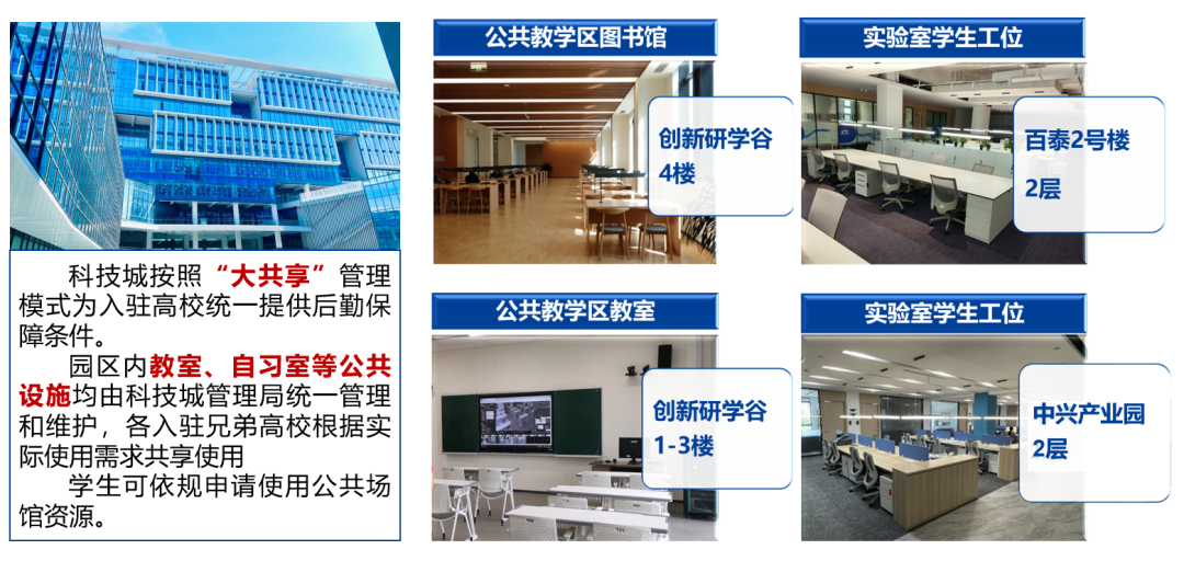 科技城按照“大共享+小学校”管理模式为入驻高校统一提供完备的后勤保障条件。