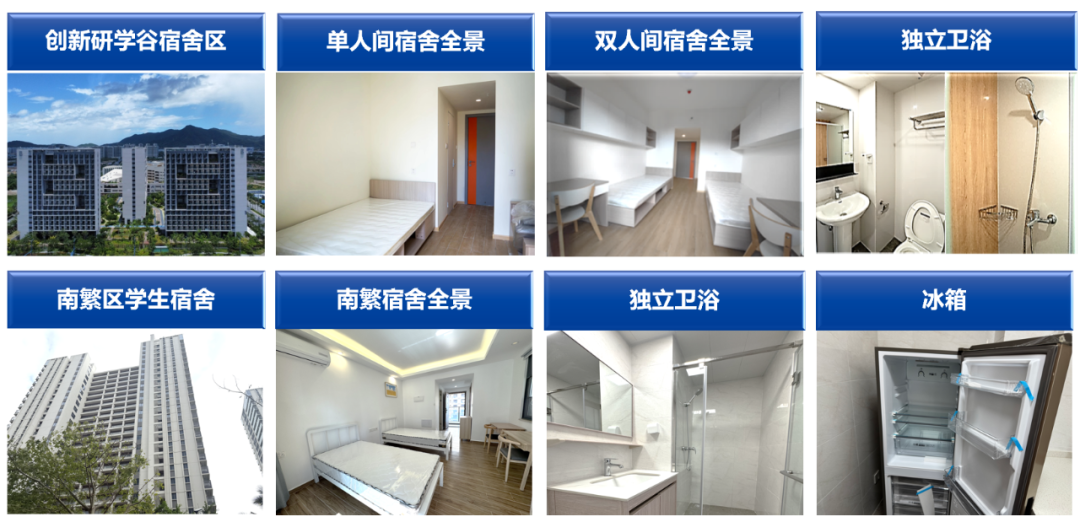 当前创新研学谷宿舍区的博士屋为单人间;硕士屋为双人间,每个房间配备独立卫浴、储物柜、空调、洗衣机等。