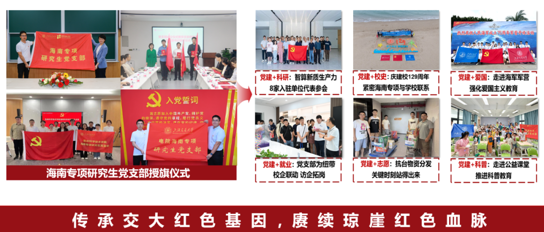 依托招生学院党委成立4个海南专项研究生党支部,研究院统筹开展海南专项研究生党支部在琼党建工作。充分开展理论实践活动,党建引领开展科研、就业、社会服务、爱国主义教育等。海南专项研究生党员屡获科技城最具影响力学生等荣誉称号,发表多篇SCI、EI等论文,获评国家奖学金、科技城科研英才等多项荣誉奖项,树立党员先锋模范作用。