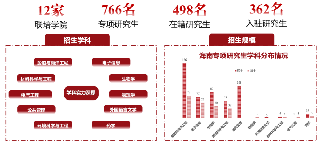 目前,依托学校ESI排名前1%等A类学科,累计招收600余名海南专项研究生,博士生占比约30%。海南专项研究生培养采取“两段式”培养模式,即第一年在学校本部按培养计划完成要求学分;第二年起进驻海南研究院开展科研实践工作。