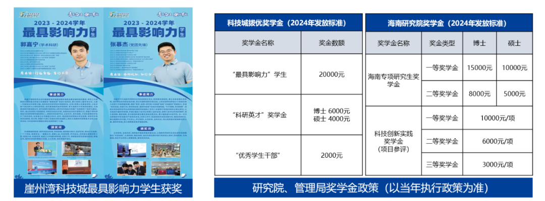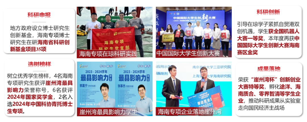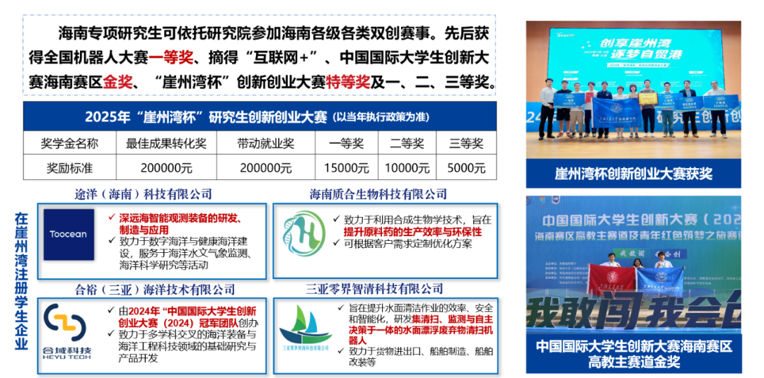 在创新创业方面,海南专项研究生斩获全国机器人大赛一等奖、连续2届中国国际大学生创新大赛海南赛区金奖等创新创业赛事;同时,孵化有途洋、海南质合、零界智清等学生企业。今年正在举办的第三届“崖州湾杯”研究生创新创业大赛,奖金丰厚,特等奖20万元,一等奖1万5千元,为大家准备了丰富的双创支持资源。